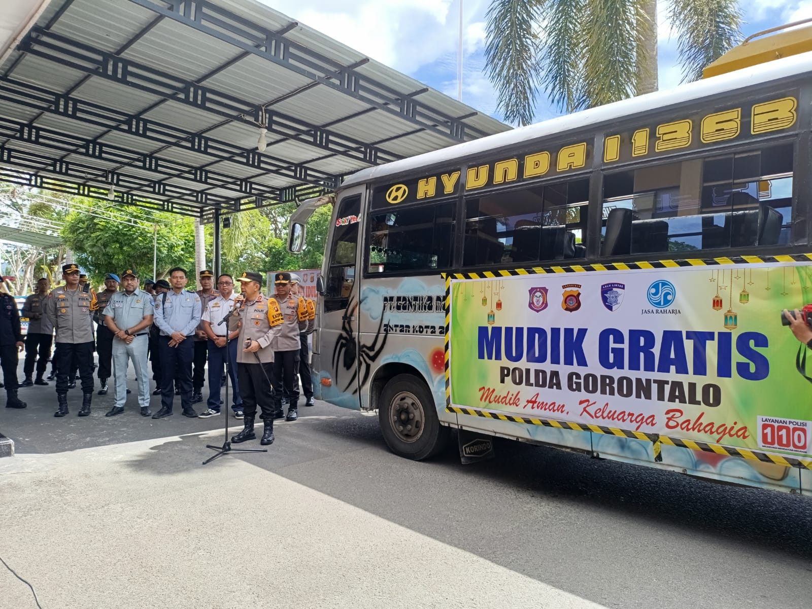 Suasana pelepasan mudik gratis Polda Gorontalo berlangsung penuh suka cita. Para pemudik tampak antusias menaiki bus yang akan mengantarkan mereka bertemu keluarga tercinta di kampung halaman lebih awal.